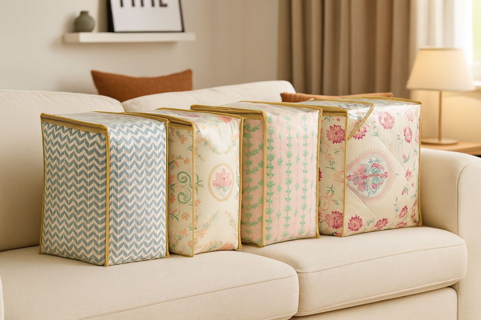 Available in multiple vibrant prints, colors to suit your taste are also available with matching color accessories etc. including AC Comforters, Quilts and Bedsheets.